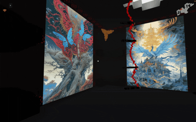 “下界”,即人类居住的现实世界,由三个漂浮着的形状像 “蛋” 一样的小空间组成。在东西方神话中都有宇宙起源于 “宇宙蛋” 的说法,这里便隐喻了 “亚鲁王宇宙” 这一含义。从天地形成、人类起源,到战争迁徙、文明创造,这一单元展示了一场由 AIGC 复现的 “苗族宇宙” 图景,插画作品分别来自于艺术家董帅、慕影和阿弥豆腐,观众可以在漫游中聆听这首珍贵的苗族史诗。